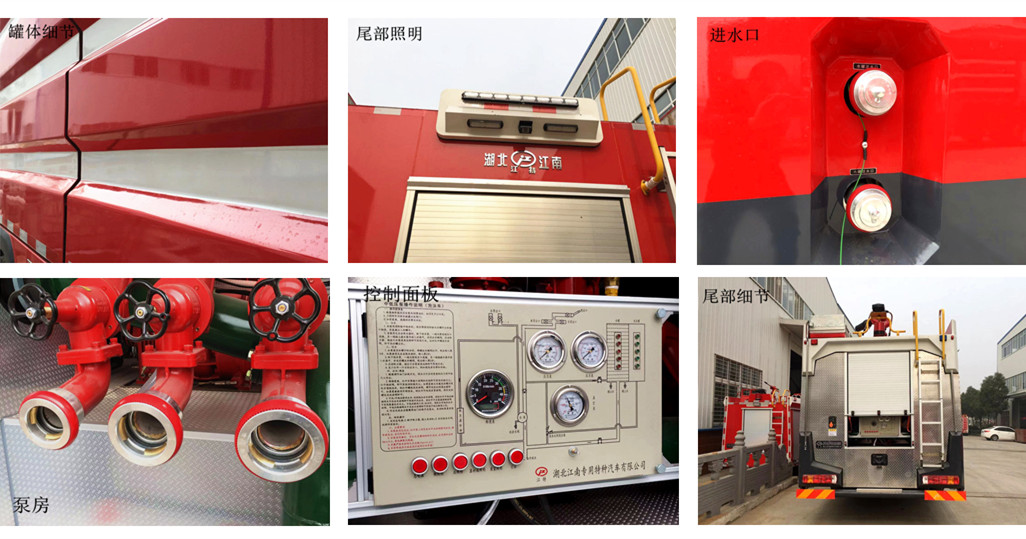駕駛室頂部前端為長排警燈,車身后配有24V/60W火場照明燈一只,車輛兩側上方各配有紅藍相配的爆閃燈,下方安裝安全標志燈,乘員室、器材箱、 泵房內均裝有照明燈,加裝有100W警報器,回轉警燈開關、通訊設備預備接口。